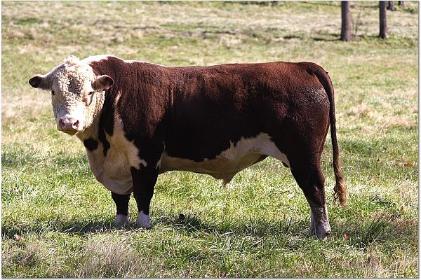 Our top Herdsire for our grass-based genetics is EEH Lamplighter 21 (Lamp). Lamp is from a Henkel Herefords, a titely linebred herd of Herefords in Fairbury, Nebraska. Lamp's sire was born in 1952, and his dam pedigree is very tight to the same cow families. We can tell a new Lamp calf from 100+ yards - they look like little blocks. Semen is available on Lamp for $25 per straw, and Lamp sons will be available for sale by Late 2008.